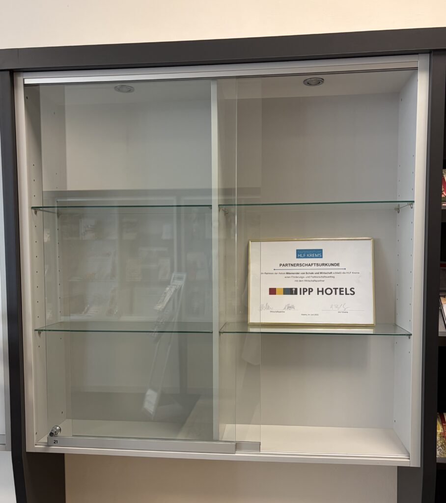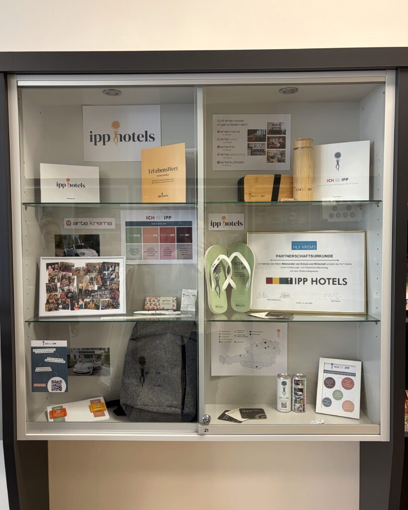 Heute waren Vanessa, zuständig für das Marketing bei den IPP Hotels, sowie Isabella, Front Office Managerin im arte Hotel Krems, gemeinsam bei der HLF Krems, welche die Partnerschule vom arte Hotel Krems ist. Dort durften die beiden den sogenannten Partnerschaukasten befüllen und dekorieren. Dieser befindet sich in der Schule am öffentlichen Gang, wo sich jede/r über die einzelnen Wirtschaftspartner der Schule informieren kann. Isabella und Vanessa hatten auf jeden Fall Spaß beim Dekorieren und gaben sich äußerst viel Mühe, um den Spirit der IPP Hotels und von ICH BEI IPP dementsprechend im Schaukasten rüberzubringen. Das ist den beiden auf jeden Fall gelungen!